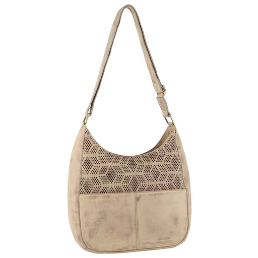 Original price $195.60Current price $107.95| /Pierre Cardin Womens Leather Perforated Cross-Body Bag with stud Detailing - Latte