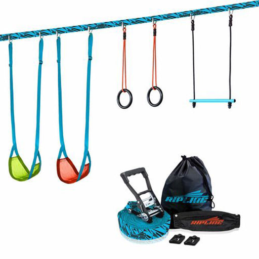 RiplineIncludes 2 soft belt swings Includes 2 ninja rings and 1 monkey bar. Both with added length for more play value. 36' Long Ninjaline with grip clip...