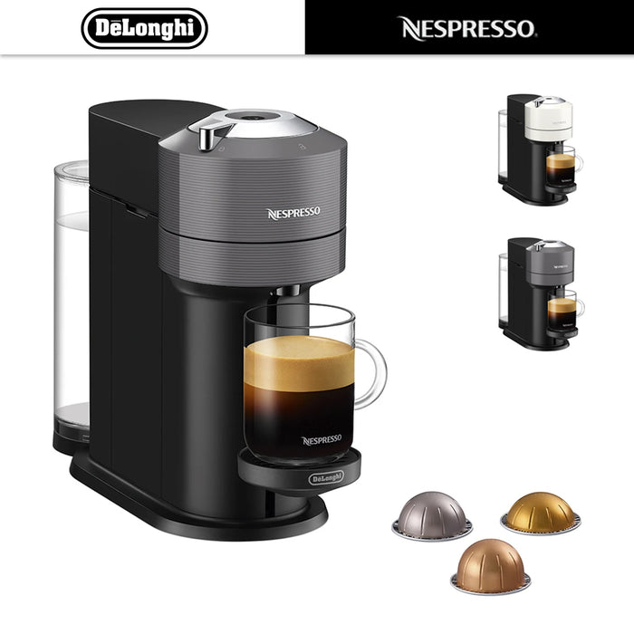 DeLonghi Nespresso introduces the VERTUO NEXT, the latest VERTUO Nespresso coffee maker with an all-new design and colors for the ultimate brewing experience. In addition to its original espressos, NESPRESSO VERTUO NEXT produces an extraordinary cup of coffee with a smooth layer of crema is the signature of truly great cup of coffee. The VERTUO coffee and espresso coffee machine conveniently makes 5, 8, 14 oz Coffee and 1.35, 2.7oz Espresso. Nespresso brings together the know-how of all its coffee experts, who have carefully chosen the origin and roasting of each coffee blend and created a brewing system using Centrifusion technology, a patented extraction technology developed by Nespresso. Just insert a Vertuo capsule and close the lever - when activated, the capsule spins up to 7,000 rotations per minute, blending ground coffee with water and producing the perfect crema to enjoy quality coffee in larger cup sizes. The machine delivers the optimal in-cup results for each blend using capsule-specific brewing with barcode reading. Each machine includes a complimentary welcome set with a range of Nespresso Vertuo capsules with unique aroma profiles. Order your Nespresso capsules, receive personalized advice, and obtain technical support or repair for your machine through the Nespresso Club via mobile app, online at Nespresso.com, by telephone or in one of our Boutiques. This coffee machine is compatible with Nespresso pods. Input power (W):1260