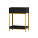 Upgrade your bedroom to the latest contemporary style with the MASON Bedside Table from Artiss. A thick board construction is topped with a black paper finish and set inside a sturdy gold metal frame, with nods to classic design eras such as Hollywood Glamour and Art Deco. Sleek metal handles and smooth metal runners slide drawers in and out with ease. The raised bottom shelf makes it easy to store your bedroom essentials in an easy-to-reach place. Floor protectors keep the unit in place and prevent scrapes and scratches on your floors. The smooth surface makes the bedside table easy to clean and maintain. With simple assembly instructions, you’ll be able to put together your new bedside tables in no time. Elevate your bedroom today with the inspiring MASON Bedside Table from Artiss.
