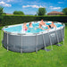 This Bestway Power Steel™ Frame Pool features a rust-resistant steel frame, UV-resistant PVC and polyester walls, and a durable, semi-permanent design for summer-long use. It includes an easy-drain valve with a garden hose adapter for convenience.