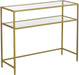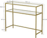Stunning Minimalism: Take your home to the next level with a modern console table that unites sleek, gold-colored metal and 2 tempered glass shelves into one minimalist-yet-functional piece.
