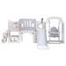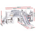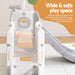 Keep your kids active and entertained with the Keezi 4-in-1 play set. It includes a child-safe swing, wide platform, fun telescope, and dual ladder for endless fun. Built from premium HDPE in stylish grey and white, it features anti-slip steps, safe grip handles, and ample bottom space for toy storage. One ball and ring are included for added play. Easy to assemble and ideal for indoor or outdoor use. Note: Kids should be supervised by adults when using the swing.