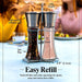 Easy Refilling with No Messes: This tall salt and pepper grinder set is the perfect size to cut down on constant refills without being bulky. When you do have to refill, the clear glass bodies will let you know when it's time! The stainless steel top easily screws off revealing a wide opening for easy and mess free refills.